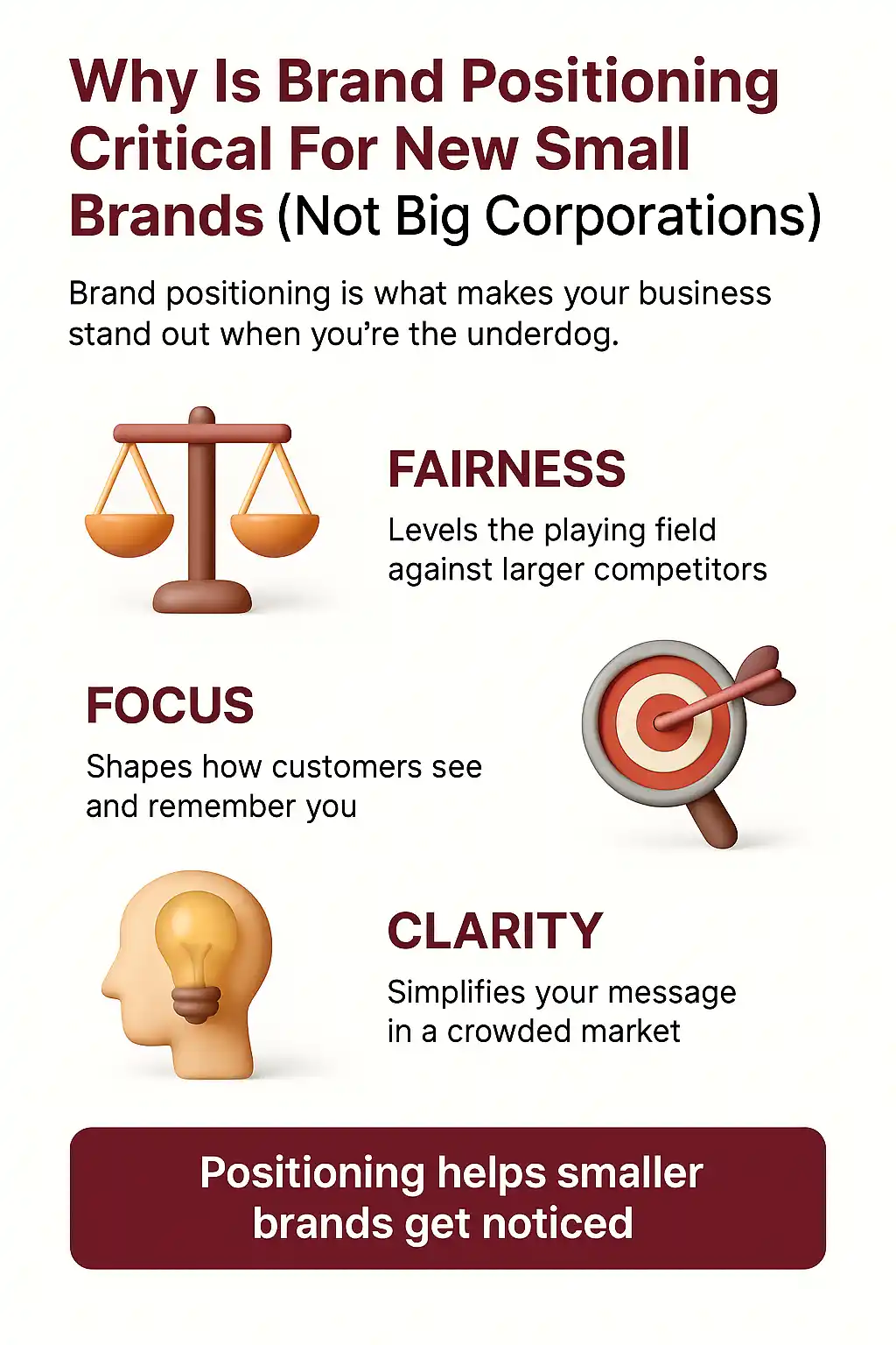 For new small brands, brand positioning isn’t a “nice to have”—it’s the strategic shortcut that levels the playing field against established corporations. Large companies already benefit from built-in awareness, legacy reputation, and deep marketing budgets. Small brands don’t have those advantages, which means their positioning must work harder and earlier.